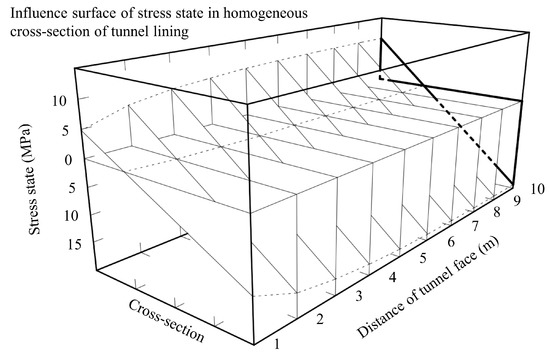 Table 3 presents the obtained results for the tangential stress in the selected cross-section of the lining. The specified stresses in the outer fibres correspond to the inner forces of the relevant stage. Figure 13 presents the influence area of tangential stress development at points 1 = 38 and 14 (see Figure 9) depending on the excavation course, i.e., with the increasing distance between the evaluated lining cross-section and the receding excavation face. The evaluated lining cross-section was 10 m from the model edge (see Figure 5).