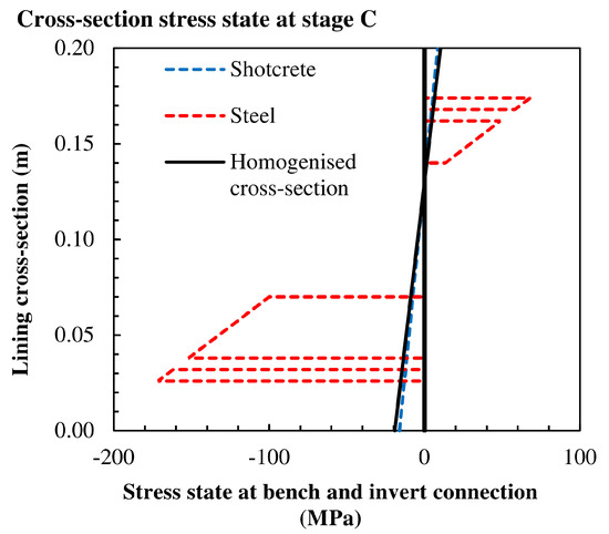 Figure 14 presents the stress in the vault at stage C, i.e., the condition where the face excavation is 10 m from the section of interest. The stress course in the homogenised cross-section of the primary lining is shown, as well as the stresses in individual elements of the lining: steel and concrete. The stress values for individual lining elements were obtained via application of the redistributing coefficients and to the stress over the homogenised cross-section. The homogenisation process, including the determination and application of the redistributing coefficients, is described in detail in the previous papers [35,36,37].