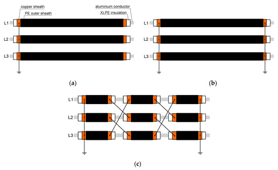 High-voltage transmission and distribution power lines are usually used overhead with bare conductors. The main reason for the widespread use of overhead power lines, instead of cable lines, is their lower investment cost. However, there are cases in which the application of overhead lines is precluded. These refer mainly to urban areas but also to rural areas when an increased risk of electric shock hazard or exposure to electromagnetic fields exists [1]. With many undoubtable advantages, the utilization of high-voltage cable lines is associated with some problems. One of the main problems is the induced voltage generated in the power cable’s metallic concentric sheath. With reference to this voltage, power cables may operate as single-point bonded, both-ends bonded or cross-bonded. Recommendations for the performance of power cables bonding and earthing are mainly included in the standards [2,3] as well as the report [4]. Figure 1 presents the three aforementioned cable bonding arrangements.