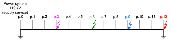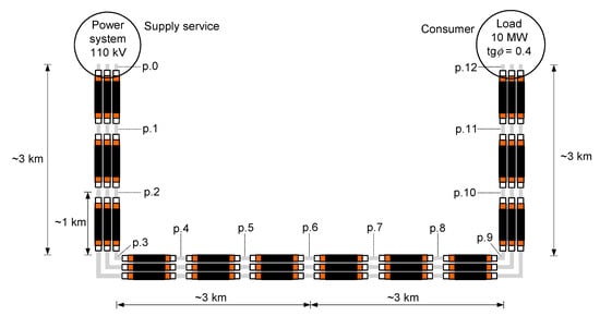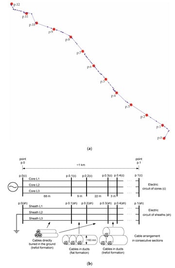 The power cable system under analysis connects a 110 kV power substation (supply service) and a dedicated consumer/load (Figure 2). The total length of the single-circuit three-phase cable line is approx. 12 km. The manufacturer’s length of the cable (minor section) is equal to approx. 1 km and the points with connections of the consecutive sections are marked p.0–p.12 in Figure 2. In some of these points, earthing and bonding (including cross bonding) of the cables’ sheaths are possible. Generally, cables are laid in trefoil formation without spacing. Some spacing, as well as short sections with flat formation, are applied in the cable ducts, what is included in the computer model.