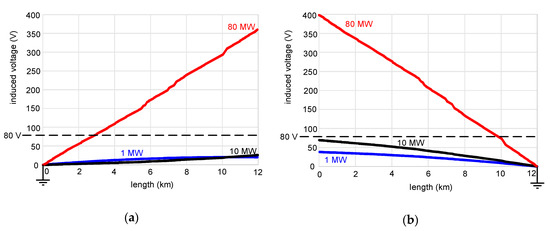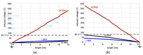 The differences in the induced voltages (Figure 5a vs. Figure 5b) are the effect of the natural load of the cable line (capacitive), which forces a capacitive current flow of a changing value along the length of the cable line. It indicates that the location of the point of the earthing (reference point) is important. Note, that for the case presented in Figure 5a, the induced voltages at the unearthed end are practically the same for the power 1 MW and 10 MW. In the case of Figure 5b, the respective voltages at the unearthed end differ about two times.