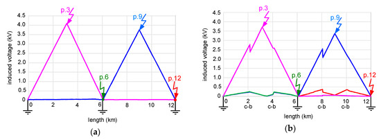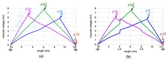 The distributions of the induced voltages for the aforementioned points of the fault are presented in Figure 10. For the both-ends bonding (Figure 10a) the line-to-earth-fault at point p.12 gives induced voltage practically equal to 0 V. It is obvious because this point is located at the consumer substation, which contains an earthing system. An earth fault in points p.3, p.6 or p.9 gives the induced voltages higher than the assumed permissible limit 5 kV (at the point of the fault). The highest value of the voltage is in p.6 (over 7 kV) mainly because it is located at the farthest distance from the earthed points (p.0 and p.12). In the case of the cross bonding (transpositions of the cable sheaths are performed in p.4 and p.8; see Figure 10b), the induced voltages in the characteristic points are only slightly lower compared to the both-ends bonding. Unfortunately, the voltages still exceed the assumed permissible level of 5 kV.
