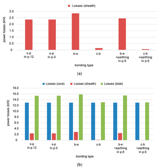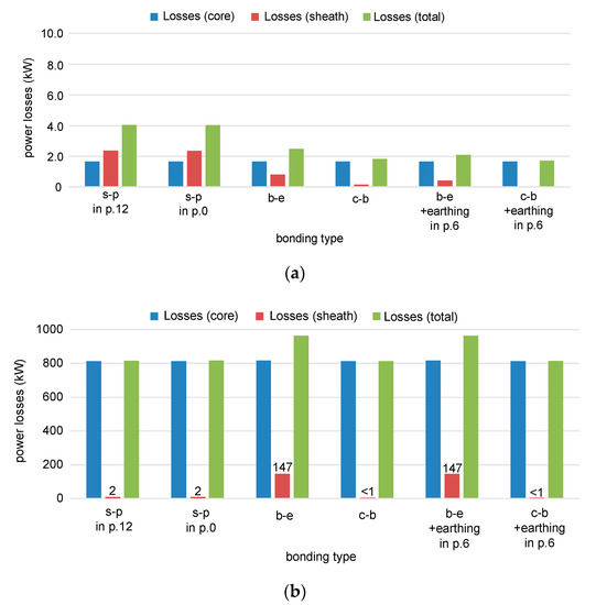 Power losses in the analyzed three-phase cable system: (a) for the transferred power 1 MW, tgϕ = 0; (b) for the transferred power 80 MW, tgϕ = 0; s-p: single-point bonding; b-e: both-ends bonding; c-b: cross bonding.