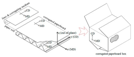 The manufacturing direction (wave propagation) of the corrugated paperboard coincides with the MD of the liners. The flute direction and the out-of-plane (thickness) direction of the corrugated paperboard coincide with the CD and z-direction of the liners, respectively (Figure 1). Therefore, the corrugated paperboard is an orthotropic sandwich structure, which has liners providing bending stiffness and flutes providing shear stiffness [,].