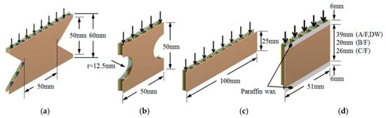The ECT value of the corrugated paperboard is used as a primary indicator representing the quality and compression strength of the corrugated paperboard box []. The shape and dimensions of the ECT specimens are different depending on various testing standards. There are four ECT methods used based on the various restrictions of the edge failure and bending behavior of the test specimen: (a) Edge-clamping method [,], (b) neck-down method [,], (c) rectangular test specimen method with small slenderness ratio [,,,], and (d) edge-reinforced method (wax coating) [,,]. Figure 2 shows a representative test specimen for each of the four methods.