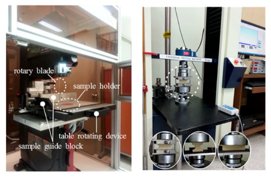 The edgewise compression test (ECT) values of two single-wall (A/F and B/F) and two double-wall (AB/F and BB/F) corrugated paperboards that are used in packaging of agricultural products were measured using the guidelines of KS M 7063-1 method A [], TAPPI T 838 [], and FEFCO No.8 [] testing standards. Inaccurate cutting of the test specimen led to decreased mechanical strength up to 14% []. To prevent mechanical strength loss due to inaccurate cutting of the test specimen, a customized rotary blade-type sample-cutting machine was used in this study (Figure 3). The cutting machine also had a sample holder to make a circular neck-down section that was required in TAPPI T 838.
