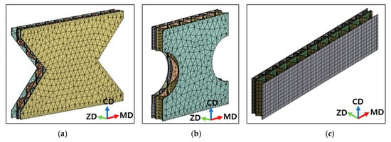 The meshed 3D models for FE simulation of A/F corrugated paperboard; they should be listed as: (a) KS M 7063-1 method A; (b) TAPPI T 838; (c) FEFCO No.8.
