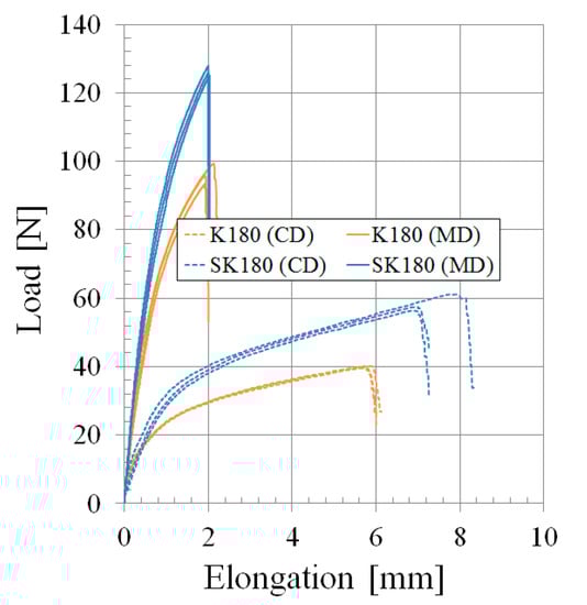 Among the material properties described above, the Ex and Ey, in-plane Elastic moduli, and the σy-MD and σy-CD values were calculated using the load vs. elongation plots (Figure 6) of an uniaxial tensile test (tensile tester: KST, capacity: 100 kgf, extensometer resolution: 0.01 mm, max. tensile force of pneumatic grip: 2 kN) based on ISO 1924 [].
