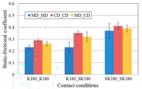 As the flute deformation in edgewise compression proceeded, the contact area between the flute and liner on the left and right portions of the shared nodes increased gradually. Accordingly, the frictional contact conditions at a portion where contact was expected were used to accurately analyze the edgewise compression behavior of corrugated paperboard. The static-frictional coefficients for various contact conditions between corrugated paperboard components were measured based on ISO 15359 [] using a frictional test device reported by Park et al. []. Figure 7 shows the static-frictional coefficient used for the model.