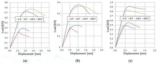 Figure 8 shows the load vs. displacement plots predicted using the FE model by flute types and standards. For all standards, the double-wall (DW) and single-wall (SW) corrugated paperboard had significantly different gradient and peak points of the load-deflection plots. For the FE model built based on the KS M 7063-1 method A [], which is an edge clamping method, the peak points of AB/F and A/F were greater than those of BB/F and B/F, respectively. However, for the models built based on the FEFCO No.8 method [], which is a rectangular test specimen method with a small slenderness ratio, there was an opposite trend compared to the KS M 7063-1. The trend change was the consequence of the relatively small slenderness ratio of the FEFCO No.8 test specimen (Table A2 in Appendix A), resulting in a reduced effect of the corrugated paperboard thickness on the edgewise compression behavior.