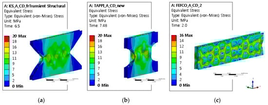 Stress distribution at the peak of the load vs. displacement plot of A/F corrugated paperboard; they should be listed as: (a) KS M 7063-1 method A; (b) TAPPI T 838; (c) FEFCO No.8.