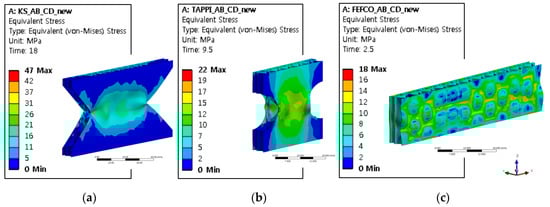 Stress distribution at the peak of the load vs. displacement plot of AB/F corrugated paperboard; they should be listed as: (a) KS M 7063-1 method A; (b) TAPPI T 838; (c) FEFCO No.8.