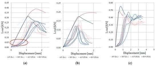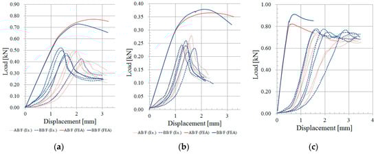 To apply the load to the specimen, the upper surface of the modeled test specimen was displaced downward with 12.5 mm/min speed simulating the deformation caused by moving plates of a compression tester [,,]. The reaction force applied to the lower surface of the test specimen was analyzed to complete the load vs. displacement plots.