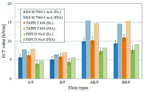 - According to the FEA results, AB/F and A/F had greater ECT values than BB/F and B/F, respectively, for KS M 7063-1 method A. However, FEFCO No.8 had an opposite trend with the KS M 7063-1 method A. For TAPPI T 838, there was a mixed trend compared to the other standards. The experimental results also showed a similar trend for the different flutes as the FEA. The trend change between the A/F and B/F or AB/F and BB/F observed for the FEFCO No. 8 samples was the consequence of the relatively low height compared to the width and small slenderness ratio of the FEFCO No.8 test specimen, leading to the small effect of corrugated paperboard thickness on the edgewise compression behavior.