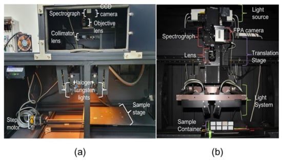 Hyperspectral imaging system (a) visible and near-infrared (VNIR) and (b) short-wavelength infrared (SWIR) range. Camera system is stationary and sample holders move.