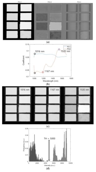 To build up a mask image, the calibrated image was used to find an optimal single band. The dimension can be reduced and data redundancy can be removed from the calibrated data to present suitable HSI and spectral data. Principal component analysis (PCA) is an unsupervised, linear data-reduction algorithm that can yield characteristic features by using score (scattering) and loading (coefficient) vectors. A line plot of the PCA coefficients represents the optimal bands of the molecular functional group [19].