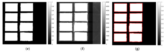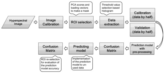 Figure 2 illustrates the ROI segmentation using SWIR hyperspectral images. Figure 2a presents the PCA score images, and Figure 2b,c present the line plots of the loading vectors (coefficient) of PC1 and PC2 and their corresponding peak images, respectively. A mask image was constructed using the histogram method, which implements the flour portion as one and background as zero (Figure 2d). The 10th band image (1016 nm) was selected to determine the optimal threshold to separate the ROI from the background (Figure 2e). The black and white mask images were constructed (Figure 2f), and they visually present the eight selected ROI regions as red rectangles (Figure 2g). The VNIR and fluorescence images also used the same procedure of mask construction by using the 10th band image (465 nm), and their threshold values from the histogram were calculated as 5000 and 120, respectively. By using the mask image, all images were segmented and the average spectrum of the identified flour regions was identified using the extracted spectral data as a representative of each modality. A total of 93,118 SWIR data were used for the development of the classification model; these were divided into training (N = 46,559) and testing (N = 46,559) data for calibrating and validating the model. The developed model was compared to accuracy (A) and Cohen’s kappa coefficient (K) based on confusion matrix [3]. Cohen’s kappa coefficient ranges from 0 to 1; the closer it is to 1, the better is the classification result based on the following calculation: , where is the observed accuracy and is the chance agreement. Figure 3 depicts the flowchart of the development of the data processing and prediction model. Finally, we obtained a full spectra matrix comprising VNIR, fluorescence, and SWIR images of 75,308 samples × 125 bands, 76,886 samples × 65 bands, and 93,118 samples × 224 bands, respectively.