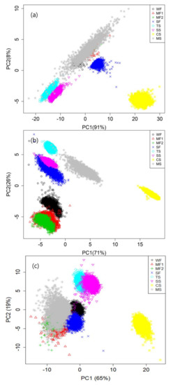 The PCA allowed us to obtain the representation of the multivariate information, and it was used for dimensional reduction without supervision. In this study, PCA was used for selecting an optimal wavelength for classification of the grain flour samples. By using the extracted full spectra matrix of each modality, we could obtain the PCA results, as shown in Figure 4. The PCA results of VNIR and SWIR indicated that mungbean starch (MS, gray color) covered other samples on each PC combination (Figure 4a,c). In contrast, the fluorescence images of the two PC spaces showed distinguishable clusters (Figure 4b). In the space of PC1 and PC2 for fluorescence range, the grain flour sample clusters were observed to be separate from each other; the proportion of the variance explains by the PC1was 71% and PC2 was 26%. VNIR and SWIR demonstrated the proportion of the variance from PC1 and PC2 as 91%, 8% and 65%, 19%, respectively.