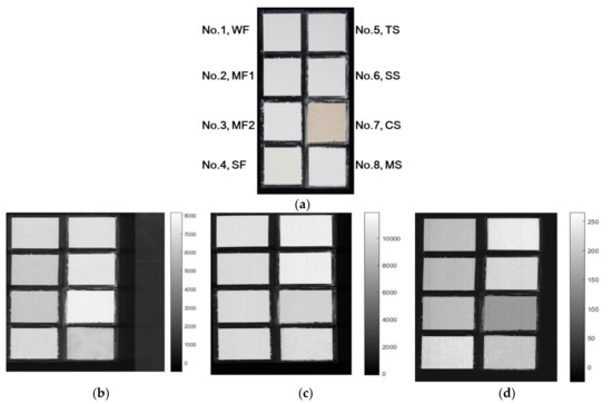 As shown in Figure 5, the three single-band images display the peak band of three modalities to generate patterns of a grain flour image based on each imaging type. Single-band images of the peak wavelength obtained from the multimode HSI system show color (Figure 5a), SWIR, VNIR, and fluorescence, images in the 1060 nm (Figure 5b), 959 nm (Figure 5c), and 518 nm ranges (Figure 5d) according to loading vectors, respectively. The eight grain flours show similar surface colors except No. 7 (CS) in VNIR and SWIR, whereas fluorescence images show more dynamic and significant surface colors according to rice or starch flours.