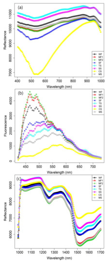 Mean spectra of VNIR (a), fluorescence (b) and SWIR range (c) of eight grain flours’ data.