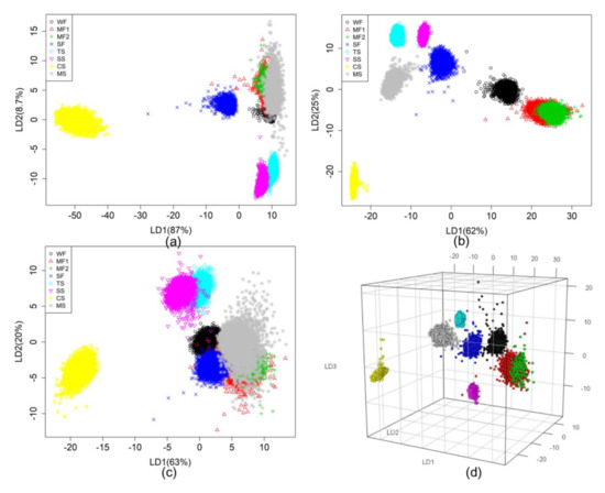 Figure 7 shows the classification result of the three multimode HSI data based on LDA with normalization. VNIR (Figure 7a) shows 87% and 8.7% of the classification potential of LD1 and LD2, respectively, while fluorescence imaging shows the potential of 62% and 25% in 2D space (Figure 7b) and 3D space (Figure 7d), respectively. SWIR using LDA with normalization shows that LD1 and LD2 depict interpretation potentials of 63% and 20%, respectively (Figure 7c). In the figure, on the bottom right, the gray asterisk represents the data of mungbean starch (MS), which makes difficult to separate all rice flour samples (WF ○, MF1 △, MF2 +, SF ×) in the 2D space.