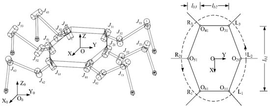 Hexapod robot HITCR-II has 18 joints and complex movements. As shown in Figure 2, is the reference coordinate system based on the ground, and is the trunk coordinate system, the origin of which coincides with the geometric center of the trunk. The X, Y, and Z coordinate axes meet the right-hand helix law, the X axis is consistent with the forward direction of the robot, and the Z axis is perpendicular to the torso surface and opposite to the direction of gravity. The three left legs of the robot are represented by L1, L2, and L3 respectively, and the three right legs are represented by R1, R2, and R3, respectively. Starting from L1, the robot is arranged in a counterclockwise order. is the leg coordinate system.