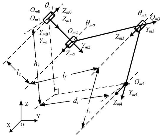 In Figure 3, is the coordinate system of the n-th joint of the m-th leg. The coordinate axis is consistent with the direction of the joint axis, and the forward direction and the opposite direction of gravity are positive. The Ym-axis is connected to the lower joint of the joint. The axis of one limb coincides and points to the next joint. The foot end coordinate system is represented by , and its coordinate axis direction is consistent with .