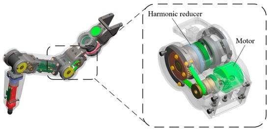The main parameters of the robot HITCR-II are shown in Table 1. The weight is 3.2 kg, the length and width of the trunk are 320 and 136–196 mm respectively, and the longitudinal and transverse spans under the initial pose are 400 and 380 mm, respectively. Compared with hexapod robots with the same performance at home and abroad, the robot has obvious advantages of miniaturization and lightness. In order to reduce the volume and weight of the joint, a joint design scheme based on brushless DC motor drive, harmonic reduction, and synchronous belt drive was developed. The final structural parameters of the realized joint are 58.5 mm long, 42 mm wide, 28 mm thick and 118 g heavy. The base joint angle range is , base-femoral joint angle is , and femoral-tibial joint angle is . Figure 4 is the structure of modularized joint.