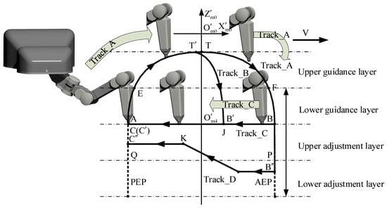 The foot of the hexapod robot is composed of a base joint, a base-femoral joint, and a femoral-tibial joint. A reference coordinate system, , for trajectory planning is established with the center of the base joint axis as the coordinate origin to facilitate gait control, unified planning, and coordination of the trajectory of each leg and foot end. The direction of each axis of the coordinate system is consistent with the trunk coordinate system , is perpendicular to the trunk and opposite to gravity, and is the same as the forward velocity, V, of the robot. The model of the planned foot trajectory is shown in Figure 5. The swing phase and support phase in the foot trajectory are planned in the reference coordinate system . origin is the projection of the m-th leg and foot endpoint on the plane of the corresponding reference coordinate system in the initial pose. Track_A (curve QATBP) is the projection of the swing phase trajectory on the plane . The trajectory is divided into the ATB section of the guide layer and the adjustment layer CQ and BP. The trajectory of the guidance layer mainly realizes the swing function and has good shape and dynamic characteristics. This layer is divided into an upper guidance layer and a lower guidance layer. The distinction between the upper guidance layer and lower guidance layer is used for the robot’s autonomous judgment and selection of pose control strategies. The adjustment layer trajectory is mainly used to realize the adaptation function to the ground. It is divided into upper and lower adjustment layers, and a simple trajectory is used to solve the ups and downs of the foot directly and effectively. The judgment of the foot point needs to combine the force sensing function of the leg and use the joint torque sensor of the base-femoral joint to sense the contact of the foot end with the ground. Then, the foot end is converted from the swing phase trajectory to the support phase trajectory. When the robot is walking on a flat terrain, the swing phase trajectory only contains the guidance layer, starting at point A and ending at point B. When walking on a rugged terrain, the swing phase trajectory can end at any point of the curve TBP section to switch to the support phase trajectory. If the end point is higher than the horizontal position, it ends at the guide layer, and if it is lower than the horizontal position, it ends at the adjustment layer. Track_B (curve) is the trajectory of the swing leg entering the support phase in advance, and this trajectory meets the needs of gait control.