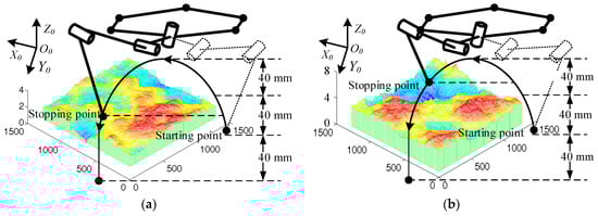 LT_State is the flag for lightly rugged terrain, HT_State is the flag for severely rugged terrain, and the status flag is 1 to stimulate the corresponding mode. When LT_State = 0 and HT_State = 0, it is judged as no foothold. As shown in Figure 6, in case (a), when the end of the foot swings from the reference ground to the terrain with a height range of [0,40] mm, ordinate of end point in the leg coordinate system is located in the lower guide layer, and the terrain is judged to be slightly rugged by leg i. In case (b), when the end of the foot swings from the reference ground to the terrain with a height range of [40,80] mm, ordinate of end point in the leg coordinate system is located in the upper guide layer, and the terrain is judged to be severely rugged by leg i. When the foothold is in the adjustment layer, the judgment is the same as that in the navigation layer. If any leg determines that the terrain is severely rugged terrain, the pose adjustment mode corresponding to the severely rugged terrain is stimulated.