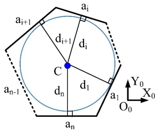 The configuration and motion mode characteristics of the hexapod robot determine that it has a high stability margin. The stability of the walking robot is evaluated by the size of the stability margin (SM) (Zero Moment Point). The widely used criterion of the stability margin is the ZMP (Zero Moment Point) principle, which is defined as the minimum distance between the projection point of the center of gravity vector on the supporting polygon and each side of the polygon. The motion characteristics of the hexapod robot determine that it can be analyzed in a quasi-static way. Therefore, the minimum distance of the center of gravity from the supporting polygon to each side of the polygon is taken as the evaluation standard of the stability margin, ignoring the effect of inertia. As shown in Figure 8, the stability margin for n-side shape is shown as follows.