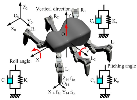 According to the characteristics of the FBM mechanism of the hexapod robot, a virtual suspension dynamic model (VSDM) is established to suppress the change of posture during walking, in the vertical, pitch, and roll directions of the torso, as shown in Figure 3. A one-dimensional virtual spring damper is set up, and the vertical direction fluctuation and the pitch angle and roll angle disturbance are suppressed by controlling the spring damper. Here, the ground and the body are assumed rigid, and the mathematical expression obtained according to the model is as follows: