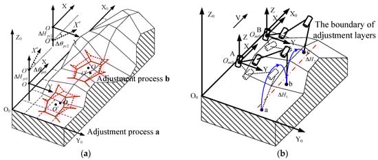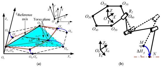 After the MP is determined, the posture of the torso is adjusted by taking the line of the coordinate origin of the hind leg and the middle leg of the main support leg as the reference axis, and the torso plane parallel to the MP as the control target. As shown in Figure 13a, taking the six-leg simultaneous support state as an example, leg triggers severely rugged flag , and it is judged as LMP. The reference axis is , and the posture control target is plane parallel to the LMP. The control quantity composed of the height of the trunk, the pitch angle, and the roll angle can then be obtained. In pose adjustment, except for the two legs that determine the reference axis, the trajectories generated by the pose adjustment movement at the origin of the other leg coordinate systems are shown as , , , and , as shown in Figure 13b, where the foot end trajectory is planned in the leg coordinate system. The trajectory is an arc with the same shape and opposite direction as the origin of the leg coordinate due to the relative motion because the supporting foot end is stationary relative to the ground. In pose adjustment under this planning method, the pitch angle and the yaw angle have a strict correspondence because of the height of the trunk. Therefore, only one of the factors, instead of three, is required as the control quantity to realize the pose adjustment. The amount is controlled separately, reducing the control burden.