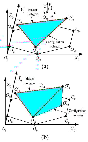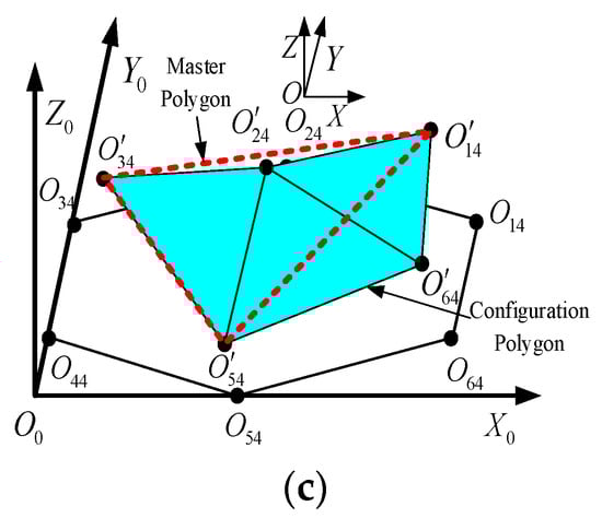 The polygon formed by the end points of each supporting foot of the hexapod robot in the torso coordinate system is called the configuration polygon (CP). Affected by the rugged terrain, the CP is generally a spatial polygon. Figure 12 shows the CPs formed by the end points of the feet when supported by three, four, and five legs. In the case of four and five legs, not all the end points of the feet are on the same plane. From the gait rules, at least three non-adjacent legs are in the supporting phase at any time, and the triangle that is stipulated to be formed by connecting the end points of the three non-adjacent legs is the master polygon (MP). A unique MP always exists in any CP during walking, or it is the LMP formed by the end of the foot of leg , , and , or the RMP formed by the end of the foot of leg , , and . The CP of the hexapod robot and the terrain jointly determine its pose, and it cannot be used as a reference plane to measure the pose of the torso because it is a spatial polygon, while MP approximates the orientation characteristics of the CP, so MP is used as the position. The reference plane for pose adjustment and the selection rules are as follows: