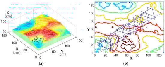 As shown in Figure 15a, the terrain is randomly generated in a three-dimensional (3D) coordinate system by using MATLAB software, and the maximum height difference of the entire terrain is 210 mm. In addition, the hexapod robot model is established to verify whether the posture control strategy can realize the robot’s traversing of rugged terrain. The target path of the robot traversing the terrain is a diagonal line through the coordinate origin, and different colors of the terrain represent different heights. The projection of the main support foot in the XY plane in each stage of walking is calculated, as shown in Figure 15b, where the dotted line is LMP projection and the solid line is RMP projection. Finally, the robot successfully traverses the terrain.