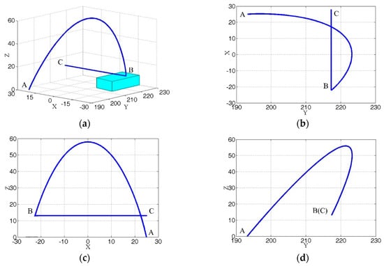 Figure 17 is the foot trajectory curve that the hexapod robot adjusts automatically when encountering obstacles. The trajectory at the beginning is planned according to the established boundary conditions and functions. Starting from the starting point A, the foot touches the obstacle during the swing process and ends. For the initial swing trajectory, update the boundary conditions and call the support phase trajectory function. Starting from the transition point B, the foot end moves along the support phase trajectory to the end point C. It can be seen that this strategy can generate a foot trajectory that satisfies the functions of swinging and supporting motion and enables the trajectory to be adjusted autonomously in real time according to changes in terrain [30].