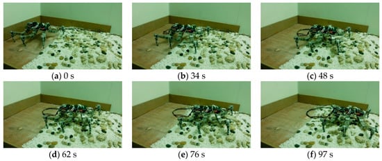 Figure 19 shows the process screenshot of the robot crossing the terrain. As shown in (a), the robot enters the slightly rugged terrain after two walking cycles, and the maximum obstacle height of the terrain is less than 40 mm, so the posture maintenance strategy is selected. As shown in (c), the robot enters the heavily rugged terrain after another 12 walking cycles, and in (d) the foot falls on a stone with a height of about 50 mm. This behavior can stimulate the posture adjustment strategy of the severely rugged terrain. The robot climbs the convex terrain in (e) and finally crosses the complex terrain in (f). Therefore, the experimental results verify the effectiveness of the posture controller and the walking ability of the HITCR in rough terrain.