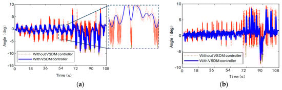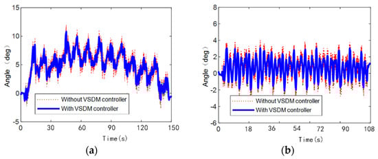The observed values of pitch angle and roll angle are shown in Figure 20a,b, respectively. Under the two conditions, the robot can successfully cross the staged unstructured terrain through the posture maintaining strategy and the posture adjustment strategy and adjust the posture of the trunk according to the changes of the terrain in the severe rough stage. The results show that the pitch angle and roll angle have a smooth, small fluctuation under the condition of the posture controller based on the VSDM model, but the pitch angle and roll angle have a large fluctuation under the condition of no posture controller based on the VSDM model. The effect of keeping the trunk horizontal in mild rough terrain is poor. The maximum angle offsets of pitch angle and roll angle are 5.2° and 4.9°, respectively. The posture controller based on the VSDM model is like a low-pass filter, which can filter out external environment interference and unstable factors of the robot’s own motion and improve the stability of the motion on the basis of realizing the target motion.