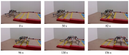 As shown in Figure 21, the heights of the three steps are 51, 34, and 51 mm from the bottom to the top. The step size of the robot is 50 mm, and the maximum height of the foot track is 80 mm. During climbing, the robot’s motion is stable. Every time a leg moves from swing phase to support phase, the posture of the trunk is adjusted to adapt to the changing step terrain. Finally, the robot successfully climbs to the top of the ladder terrain.