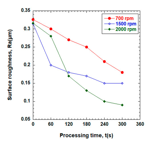 To determine the optimum finishing performance as a function of the rotational speed of the workpiece, three rotational speeds were investigated: 700, 1500, and 2000 rpm. For these experiments, the particle size was 1 μm and the magnetic pole shape was a sharp edge. Figure 5 shows the changes in surface roughness (Ra) according to different rotational speeds. The results showed that all the surface roughness values continually improved from 0 s to 300 s of finishing time. The surface roughness (Ra) was improved to 0.18, 0.15, and 0.09 μm at 700, 1500, and 2000 rpm, respectively. Thus, we confirmed that increasing the rotational speed improved the surface roughness (Ra) of the wire workpiece. This can be explained by the fact that increasing the rotational speed of the magnetic field can increase the relative motion between the workpiece surface and magnetic abrasive particles.