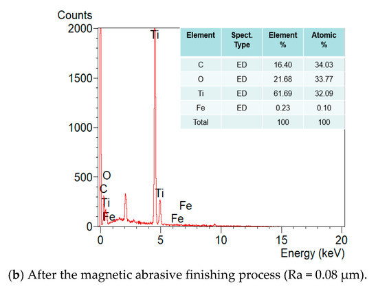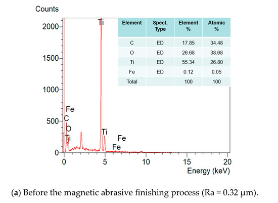 Figure 10 shows EDS chemical component analysis graphs for beta-titanium wire before and after processing. Figure 10a shows the chemical components of the material detected on the surface of the beta-titanium wire alloy workpiece prior to the finishing process: 55.34% Ti, 26.68% O, 17.85% C, and 0.12% Fe. After the finishing process, Figure 10b shows a composition of 16.40% C, 21.68% O, 61.69% Ti, and 0.23% Fe. Ti and Fe increased after processing, and O and C were lower. However, no other components were found on the surface of the workpiece after the finishing process. This confirmed that the component magnetic abrasive tools did not affect the surface of the workpiece after the finishing process. Figure 11 shows the EDS chemical composition maps on the surface of the workpiece before and after the finishing process with optimal conditions. Table 4 shows the chemical composition of β-titanium wire before and after finishing.