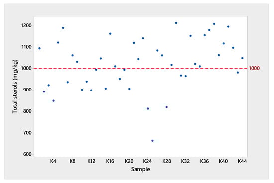 Diagram illustrating total sterols parameter (40.9% of Koroneiki olive oil samples are below the set limit of 1000 mg/kg). Dotted line represents the limit according to EEC/2568/91 for the EVOO category.
