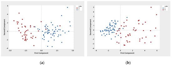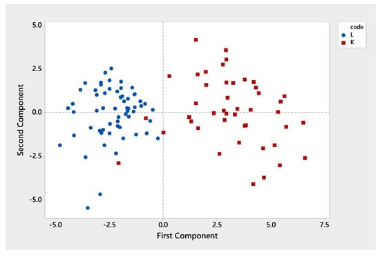 Principal component analysis (PCA) was carried out for the confirmation and strengthening of the classification of the examined monovarietal olive oils according to the cultivar. In order to restrict initial variables to a small number of new variables (known as principal components), the principal component analysis (PCA) is used to describe most of the original variations. The main goal of the key factor analysis is to identify the associated variables. The PCA score plot of Koroneiki versus Lianolia Kerkyras olive oils, according to their fatty acid and sterolic data set, is shown in Figure 2a,b respectively. In more detail, as shown in Figure 2a, the majority of K-points (corresponding to cv. Koroneiki) point to the left part of PC1, indicating that K has significant negative loads on component 2. Moreover, it can be observed that L-points (corresponding to cv. Lianolia Kerkyras) are shown on the right part of PC1, meaning that L has significant positive loads on component 1. Therefore, both K and L regions are independent and the data collection on fatty acids is not similar, impacting the two main regions. In accordance, the PCA score plot of Koroneiki vs. Lianolia Kerkyras olive oils’ sterolic profile resulted in the creation of two separate clusters as shown in Figure 2b. In that case, we noted that L points are grouped very close to each other, depicting that the variability among Lianolia Kerkyras olive oils is very small compared to that of Koroneiki samples. A low variability for L points reveals that the samples appear to be very similar to the mean for the Lianolia Kerkyras, and therefore are not affected by any external factors.