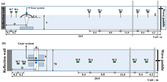 Laboratory experiments were conducted in a two-dimensional wave tank (length: 30 m, width: 0.7 m, depth: 0.9 m). A piston-type wave generator system was installed at one end of the water tank. As the hydraulic experiment using a wave generation system can generate the desired waves to simulate the ocean conditions, it can provide a lot of information about the designed WEC before the prototype experiments [41,42]. Figure 1 illustrates a schematic diagram of the laboratory experiment. A reflection wall assuming a breakwater was set up 20 m away from the wave generator. Electric capacitive type water level gauges W1–W7 (KENEK, CHT 6-43-SQ) were installed at five positions between the wave generator and the flap and at two positions between the flap and the reflected wall to measure the water level variations.