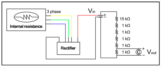 Generators can be classified into single-phase and multi-phase generators. As the number of phases increases, power losses can be reduced. However, the required electrical equipment and construction costs increase significantly. Three-phase generators that can supply power most comfortably while minimizing power losses are commonly used not only in daily life but also in power plants. Therefore, a three-phase BLDC generator was used in this study. Although the current waveform of a three-phase BLDC generator has a regular change in the polarity of the (+) and (−) poles, such as the AC in an AC generator, electricity rectifies the three-phase AC into DC. Consequently, the voltage increases by times. In this experiment, the voltage produced by the generator was rectified using a three-phase bridge rectifier (TOSHIBA, 30L6P45), and the rectified voltage was measured using a data logger. As the allowable measurement range of the data logger was within ± 10 V, the output voltage from the generator was reduced to within 10 V by using a voltage divider circuit. Figure 5 illustrates schematic diagrams of the voltage divider circuit. Vin is the voltage converted to DC by the rectifier, and Vout is the voltage measured by the data logger.
