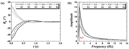 Results of free fluctuation tests of the flap for (a) the time variation of the rotation angle θx measured by the gyro sensor and (b) the natural frequency. L1–6 and R1–6 denote the cases of the flap initially tilted to the onshore (left side) and offshore sides (right side), respectively.