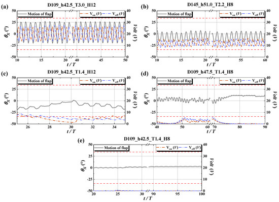 Behavioral characteristics of the flap for (a) pattern A (stable), (b) pattern B (fluctuation), (c) pattern C (unstable), (d) pattern D (loss), and (e) pattern E (Pwec = 0). Capitals of each subtitle indicate experimental conditions; e.g., D109_h42.5_T3.0_H12 denotes the distance from the reflection wall D (=1.09 m), water depth h (=0.425 m), wave period T (=3.0 s), and wave height Hi (=0.12 m).