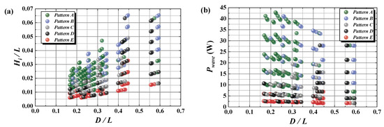 The effect of the initial water depth h on the behavior of the flap was examined. The initial water depth h was nondimensionalized by the height of the flap hf. Figure 9 depicts the patterns of the flap depending on h/hf and Pwave. The results in the range of 0.45 < D/L < 0.58, in which the invalid pattern was dominant, were excluded in Figure 9 because the effect of D/L on the flap behavior was dominant rather than h. From Figure 9a, which depicts patterns C, D, and E, the behavior of the flap tends to become an invalid pattern despite a relatively large Pwave in the water depth equal to and greater than the height of the flap (h/hf ≥ 1). In particular, the Pwave to become pattern E at h/hf ≥ 1 is larger than the Pwave at h/hf < 1. Similarly, it is confirmed in Figure 9b, which depicts patterns A and B, that more wave power is required to generate electricity normally at h/hf ≥ 1. Focusing on pattern C at h/hf < 1, even with a Pwave that is smaller than pattern E, pattern C can be observed at h/hf = 0.89 and 0.93 where the initial water depth is less than the height of the flap. For example, Pwave = 1.74 W for h = 0.93 (D/L = 0.5870 in Figure 8b) and Pwave = 4.67 W for h = 0.89 (D/L = 0.4328 in Figure 8b). Though pattern C is the invalid pattern as well, the flap is rotated irregularly for pattern C, differently from patterns D and E, which are halted without motion. Therefore, this implies that if the initial water depth is smaller than the height of the flap (h/hf < 1), the flap can easily rotate even with a relatively small Pwave.