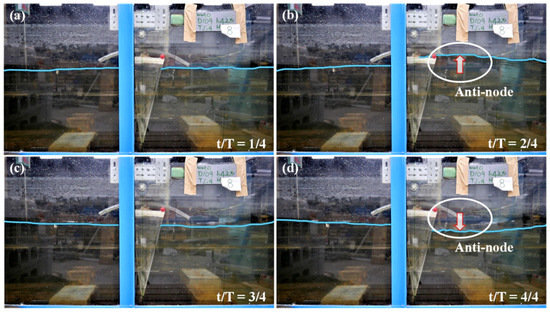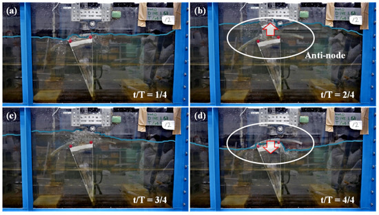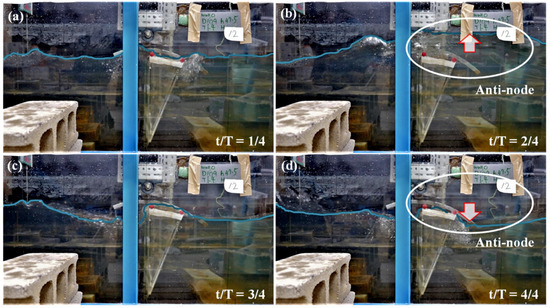 Screenshots for pattern E for the case of D = 1.09 m, h = 0.425 m, T = 1.4 s, and Hi = 0.08 m at (a) t/T = 1/4, (b) t/T = 2/4, (c) t/T = 3/4, and (d) t/T = 4/4. D/L was 0.4463.