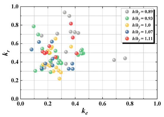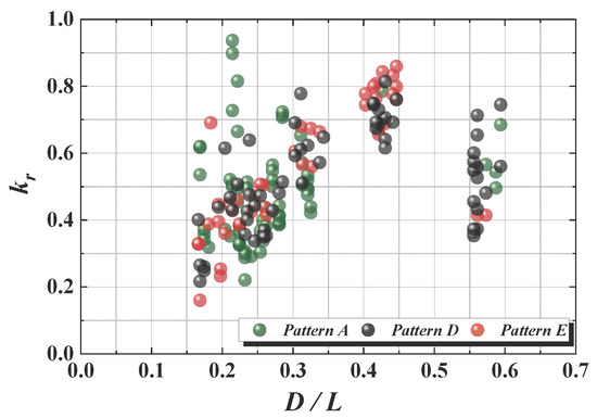 Figure 17 depicts the relationship between ke and kr for patterns A. In contrast, it is difficult to determine the correlation between ke and kr, as depicted in Figure 17. In general, a large rotation angle of the flap is accompanied by high ke so that less reflected waves are generated due to a large portion of the incident waves getting captured in the flap in terms of the conservation of wave energy. However, the case of high ke with low kr or vice versa is regarded as the flap tending to be tilted to one side, depending on the installation position (e.g., shore side for 0.25 < D/L < 0.5; offshore for 0.5 < D/L). The tilted flap to one side causes a different energy dissipation mechanism of the incident and reflected waves from the reflection wall for rotating the pendulum. As a result, kr is not proportional to ke, as depicted in Figure 17. The mechanism of energy dissipation depending on the motion of the flap and the relationship between ke and kr should be evaluated in further studies.